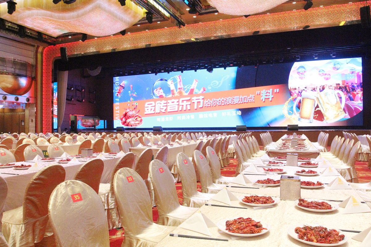 硬件方面,金砖酒店除设有各种规格的宴会大厅外,还建设了中西合璧的婚礼仪式堂,配备专属电梯、星光大道、升降舞台、空中飞人等,引进现代化灯光、舞美、演艺、电脑灯、数字灯、飞猫、音响设施设备。高标准硬件设施能在宴会中营造出惊喜,满足顾客对灯光舞美的细节要求。